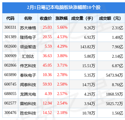 2月1日笔记本电脑板块较上一交易日上涨2.04%,苏大维格(300331)领涨。当日上证指数报收于3284.92,上涨0.9%。深证成指报收于12158.19,上涨1.31%。笔记本电脑板块个股涨跌见下表: