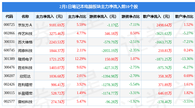 从资金流向上来看,当日笔记本电脑板块主力资金净流入1.45亿元,游资资金净流出9076.04万元,散户资金净流出5441.0万元。笔记本电脑板块个股资金流向见下表: