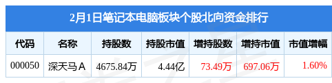 北向资金方面,当日笔记本电脑板块北向资金持股市值为4.44亿元,增持697.06万元。其中增持最多的是深天马A(000050),增持了697.06万元。笔记本电脑板块北向资金持股变动明细见下表: