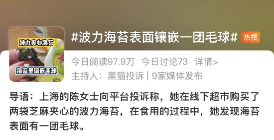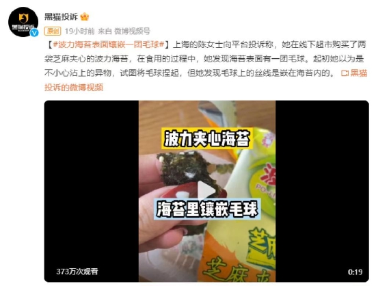 上海的陈女士在黑猫投诉【投诉入口】平台称,她在线下超市购买了两袋芝麻夹心的波力海苔,在食用的过程中,她发现海苔表面有一团毛球。起初她以为是不小心沾上的异物,试图将毛球捏起,但她发现毛球上的丝线是嵌在海苔内的。